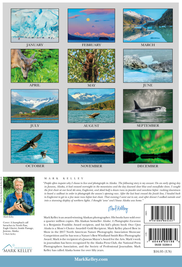Join Mark Kelley on a beautiful, year-long journey of Juneau, Alaska, and vicinity with the 2026 Juneau, Alaska Calendar. The Juneau calendar features Mark Kelley’s award-winning photography of wildlife and landscapes of the Inside Passage and Juneau, while offering a spacious calendar grid for personal notations.